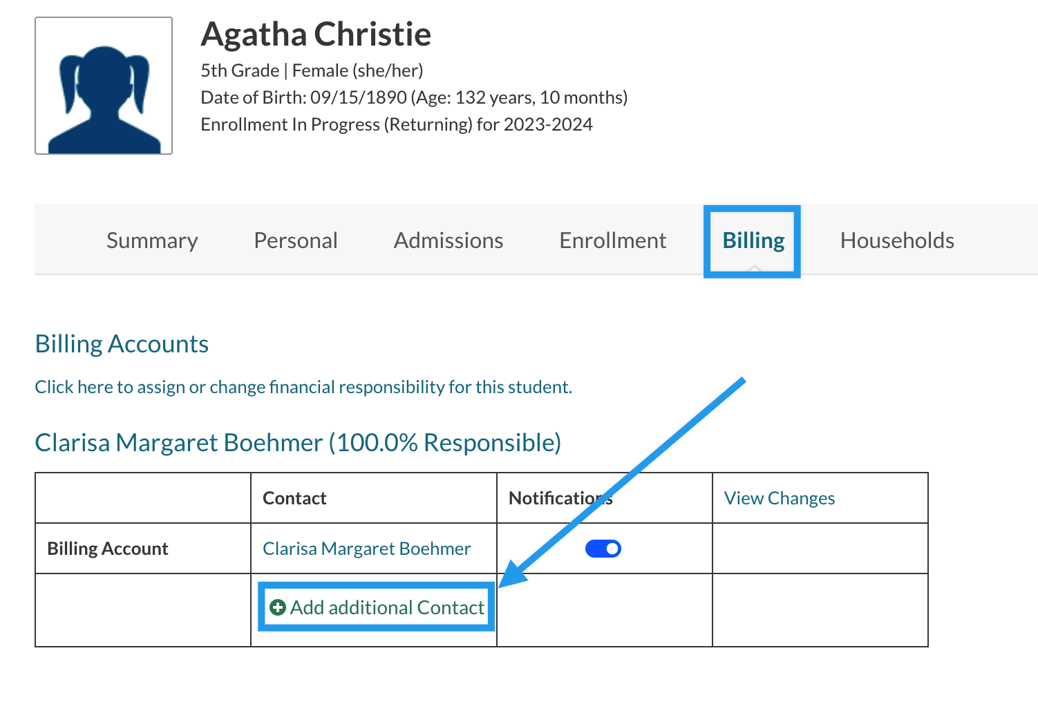 You can add a Shared Access contact from the Student's record on their Billing tab by selecting Add additional Contact.