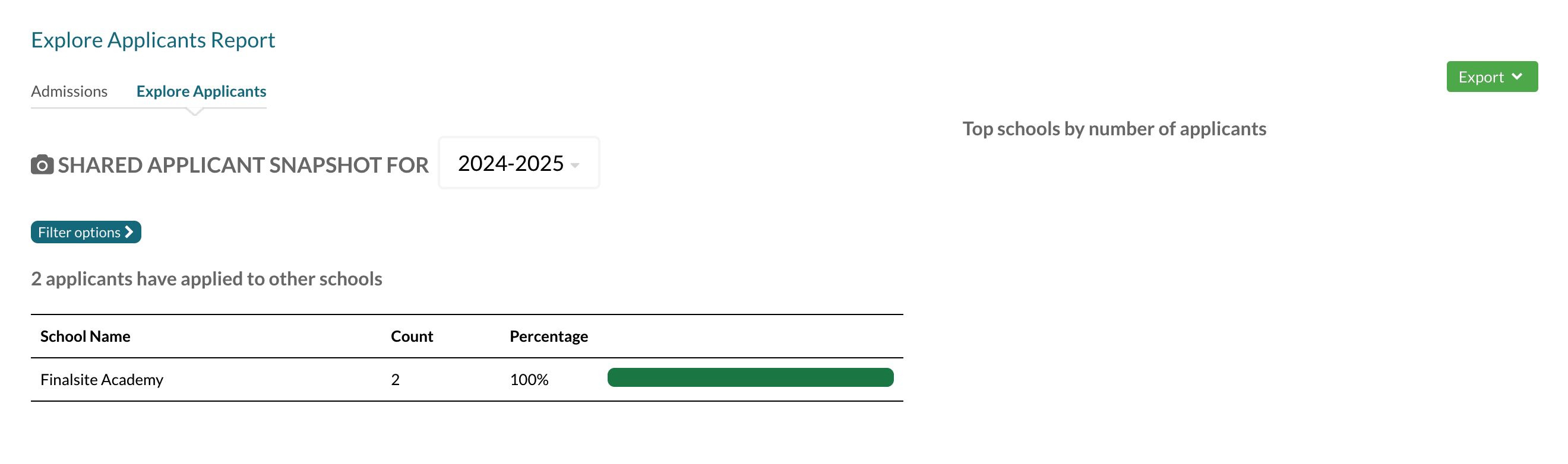 The Explore Applicants Report is a tab within the Admissions Reports (Search & Reports > Admissions Reports > Explore Applicants). This report provides data on the number of applications submitted and which school they were submitted to in Finalsite Explore.