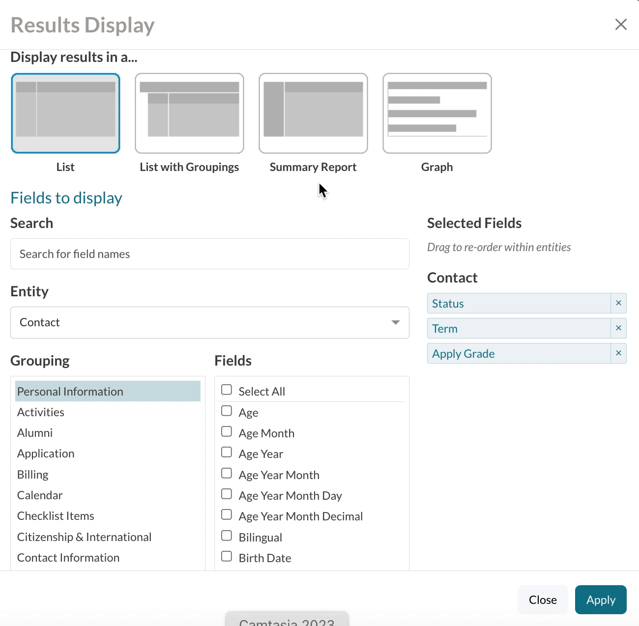 Here's an example image of building a search for Applications that came through from Finalsite Explore: