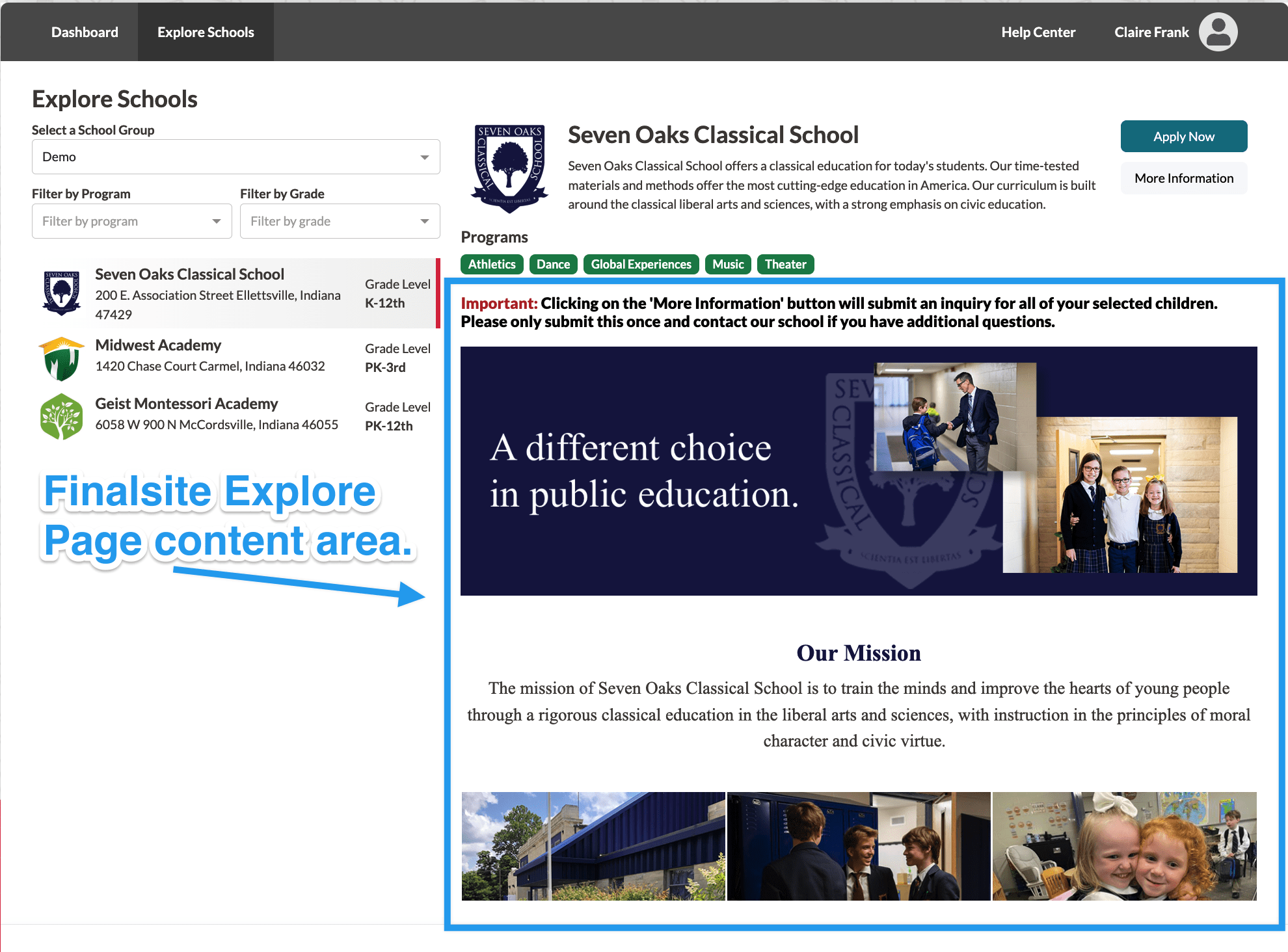 - Parents that visit can explore schools, inquire, submit applications, and track their application progress all within the portal.