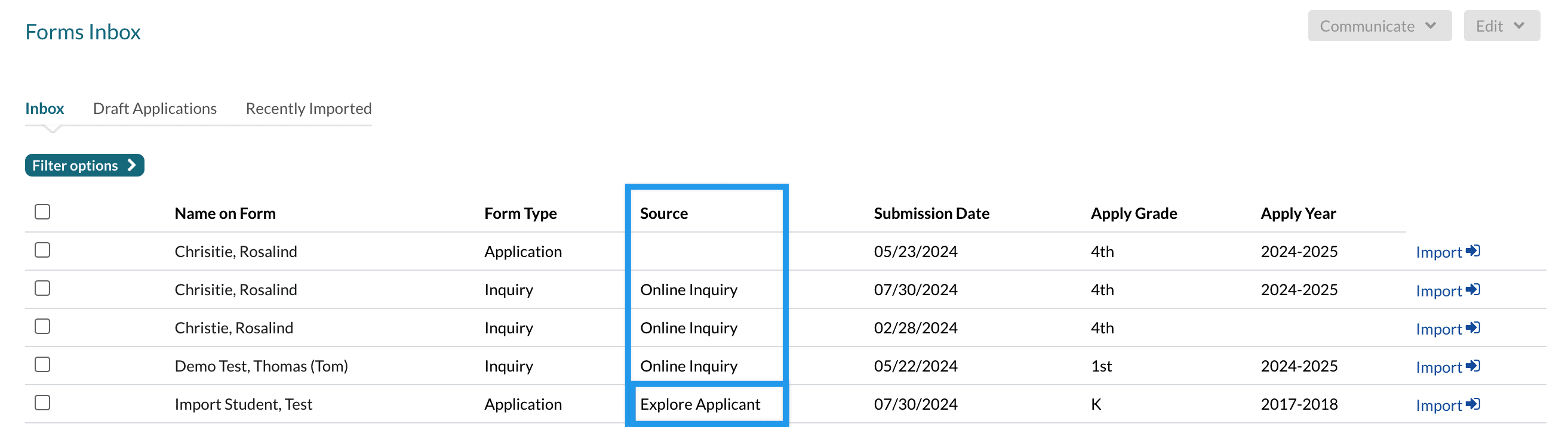 Within the Forms Inbox, when you receive a form submitted through Finalsite Explore, you will see it displayed in the Source column.