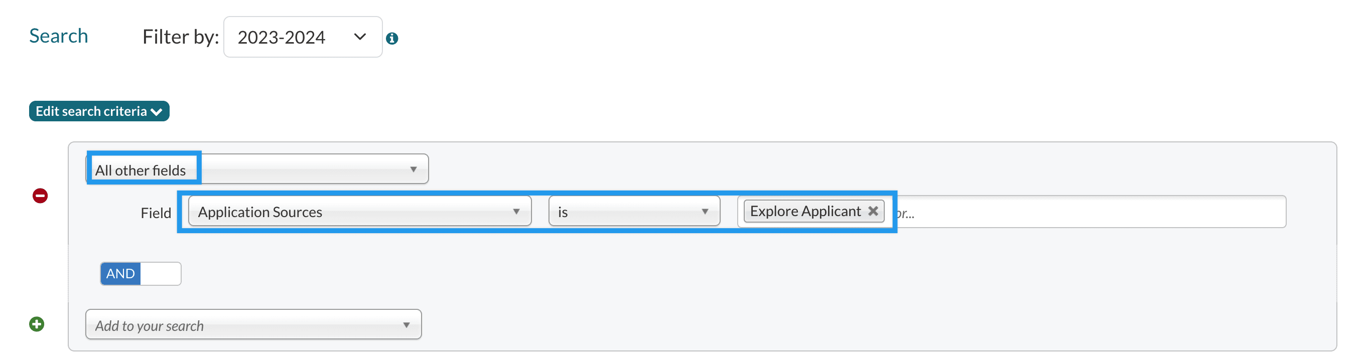 When searching, you can use the Explore Applicant field to view a list of all applications received by your school through Finalsite Explore. Similarly, the Explore Inquiry field allows you to gather all inquiries originating from Finalsite Explore.