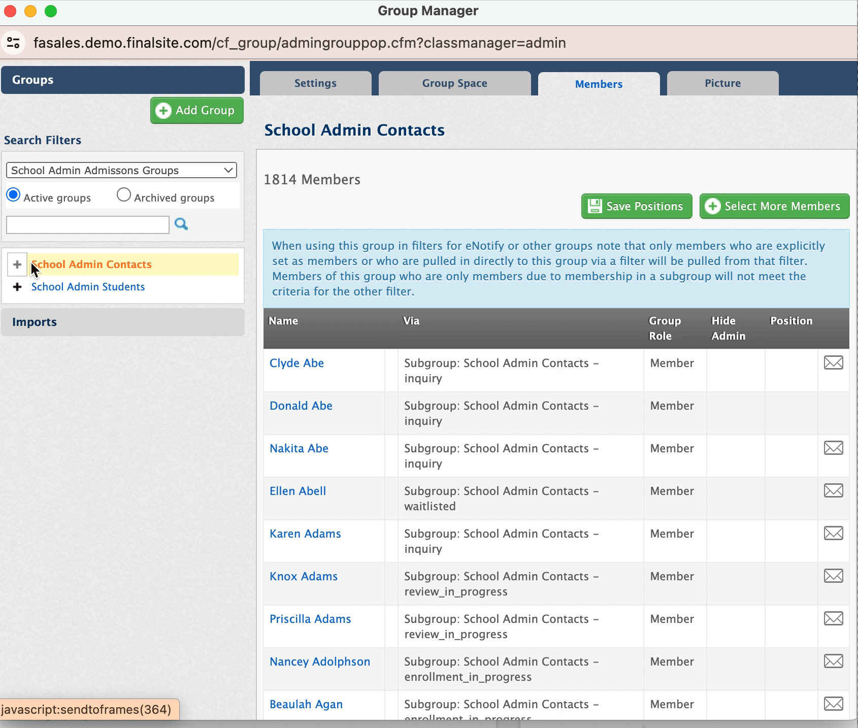Did you know that students and parents are automatically added to a group called School Admin Admissions? The School Admin Admissions group is not visible or editable in Groups Manager. You can expect to see it when setting up communications in the Messages and Workflows modules.
