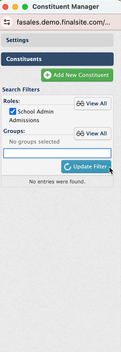 When the parent/student data first comes over from CMS, they all land in Constituent Manager within the School Admin Admissions role. It's not likely that you'll need to use this in your day-to-day work but you may need to come here if you notice anything off in a student's data that you'd like to adjust.