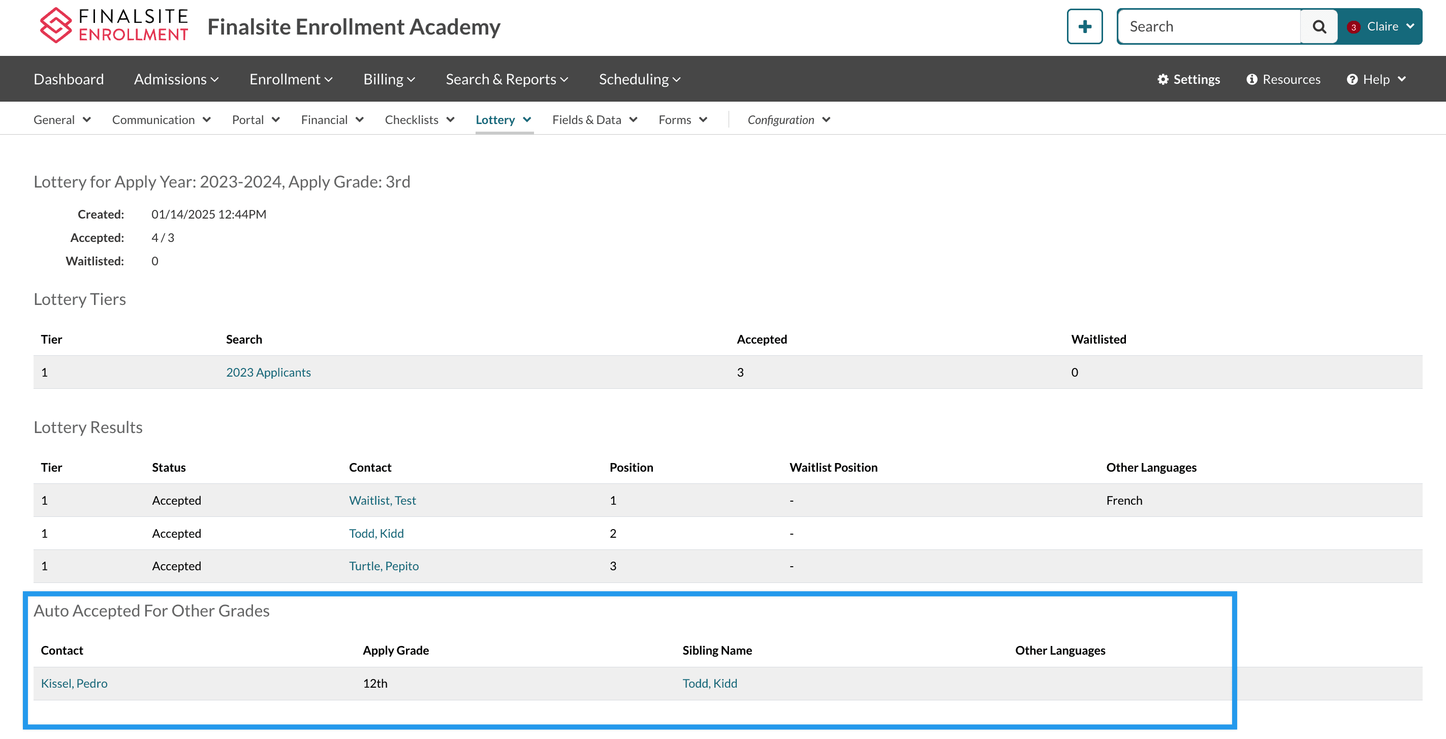 - Siblings in higher grades: When you run the lottery, if an accepted student has a sibling in any grade higher than the grade you are running the lottery for, they will automatically be accepted.