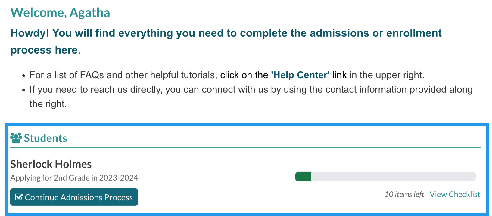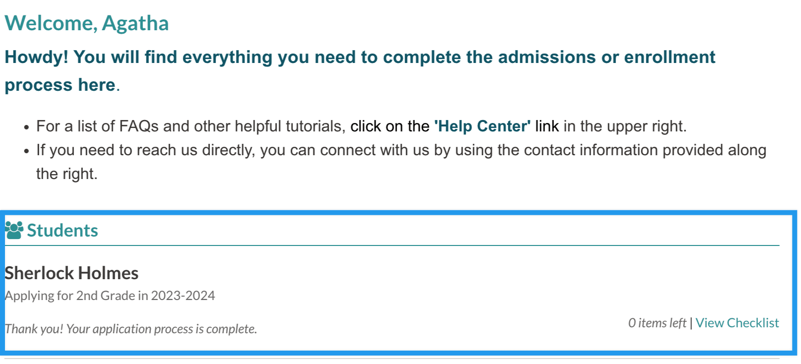 The parent will see the "Application Complete" message and still have access to their checklist.