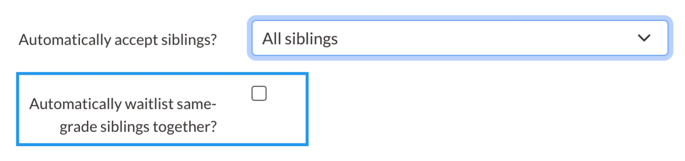 If you select All Siblings or Siblings in the same grade, you'll have the additional option of automatically waitlisting same-grade siblings together: