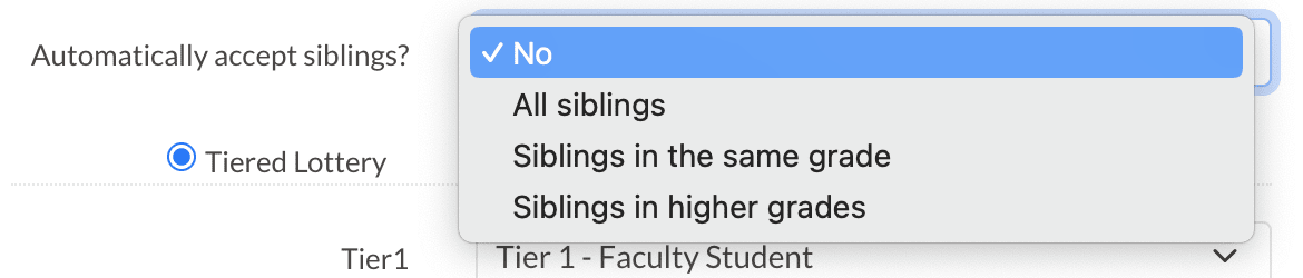 Within the lottery setup, you can set it up to automatically accept all siblings, to automatically accept siblings in the same grade, to automatically accept siblings in higher grades, or, with the "no" option, you can disable auto acceptance of siblings.