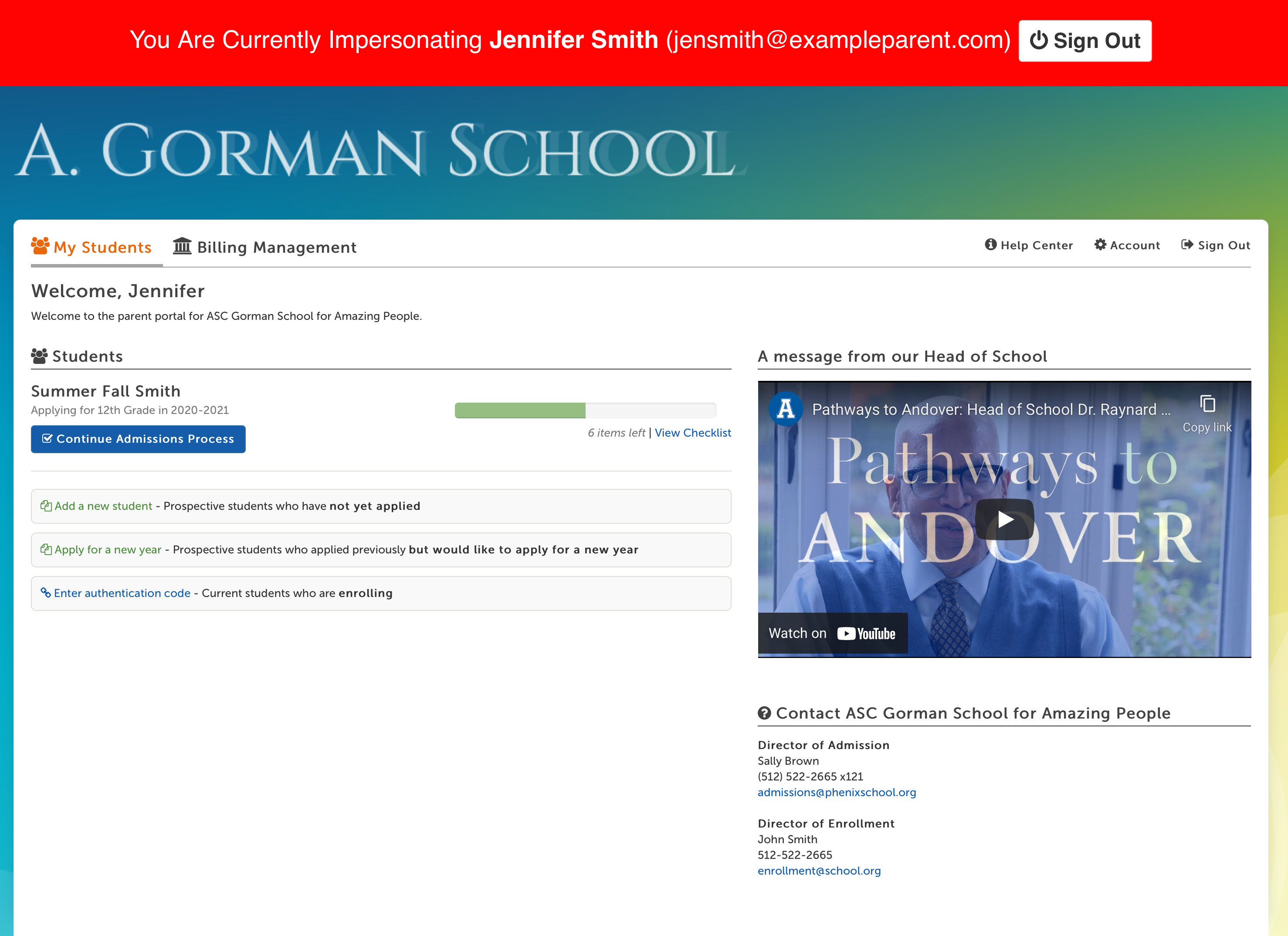 The Impersonate feature gives users the ability to mimic the login session of a parent and view their Parent Portal the same way that the parent views it. This can be helpful in troubleshooting problems and having a better context of the parent’s perspective while using Finalsite Enrollment. This article will detail how to enable Impersonate and how to use the feature.