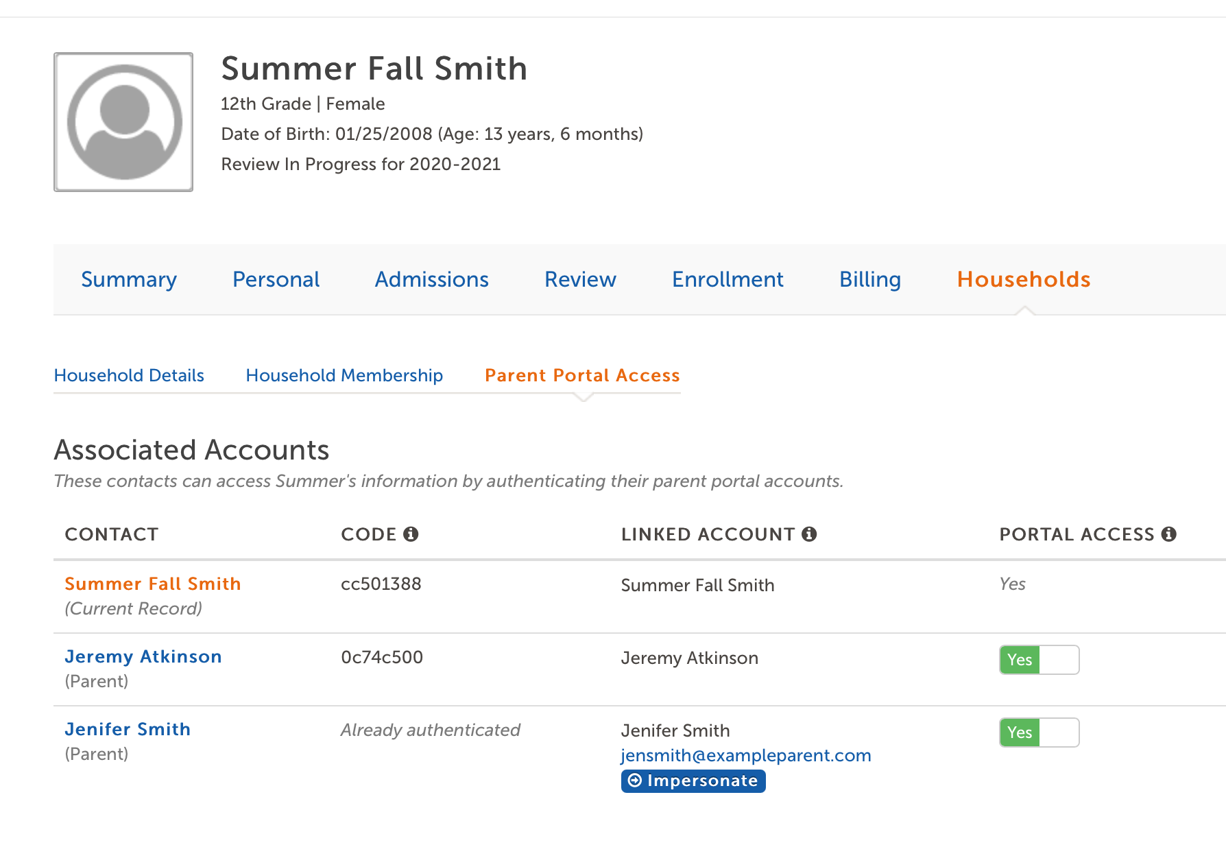 Once Impersonate is enabled for your account, you can now impersonate the login session of any parent with an associated Parent Portal account.