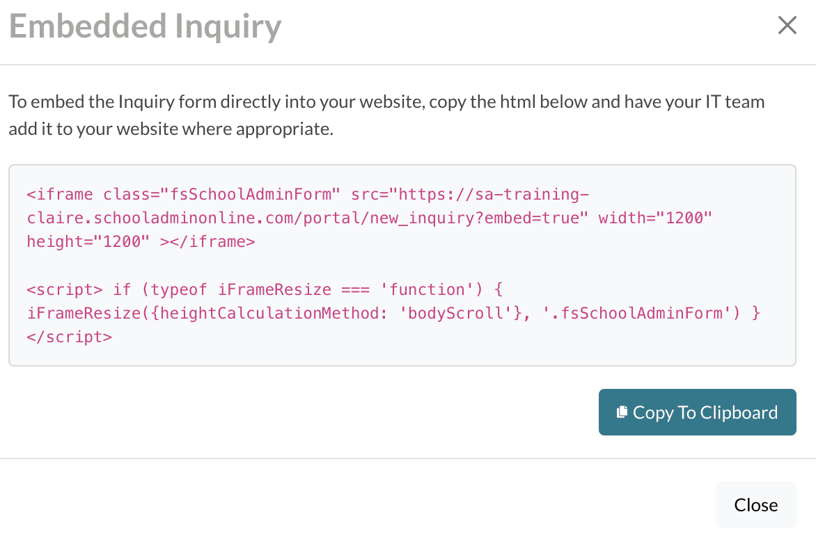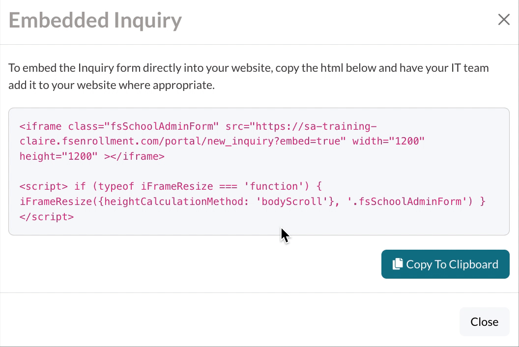 Schools can embed their inquiry form into any webpage that supports iframe embedding such as Finalsite CMS composer and other website content managers.