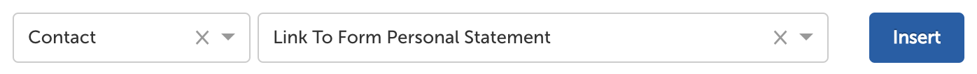 Select Contact in the first box and Link to Form [Form Name] in the second box. You can type into the second box to begin searching. Once you have selected the desired Direct Form Link token, click on Insert to place it in the body of the email. Example: