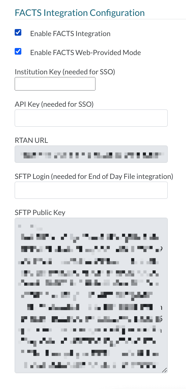 Enable FACTS Integration: This will be checked if your integration has been set up either for SSO (single sign-on) or web-provided. It will be marked for either setup.