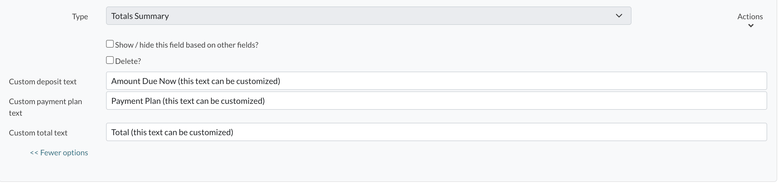 - and 6. Editable in the Advanced Editor. Type = Totals Summary. Editable text: Custom Deposit Text (not pictured), Custom Payment Plan Text, Custom Total Text.