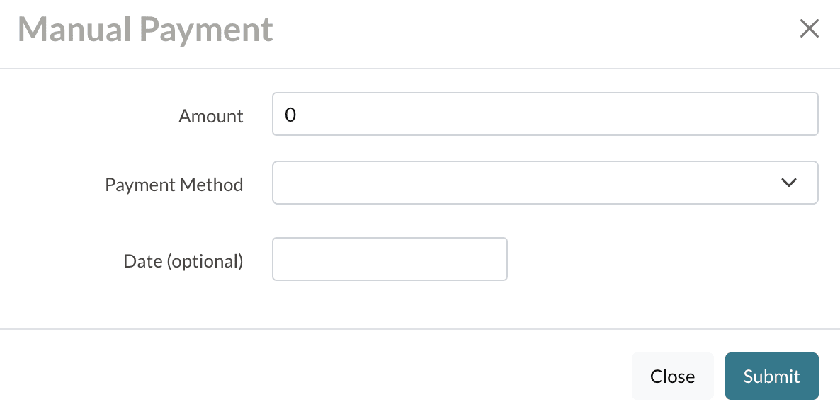 - Within the Manual Payment box, enter the amount, select the payment method from the drop-down menu, and enter the date of payment (optional).