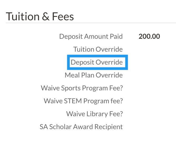 The deposit amount may also be manually set by entering a value in the Deposit Override field on a student’s contact record.