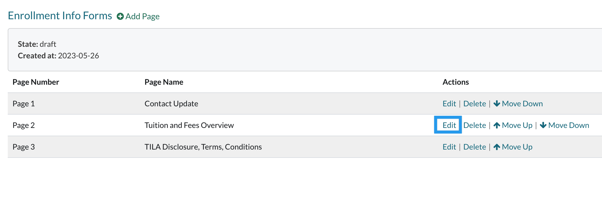- Navigate to the page containing the Tuition & Fees by selecting Edit for that page.