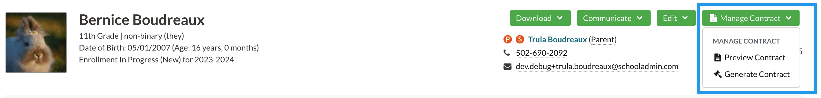 - If you have already generated the student's contract, you will have the additional option of selecting Preview Tuition & Fees which brings up a window with a snapshot of the totals.