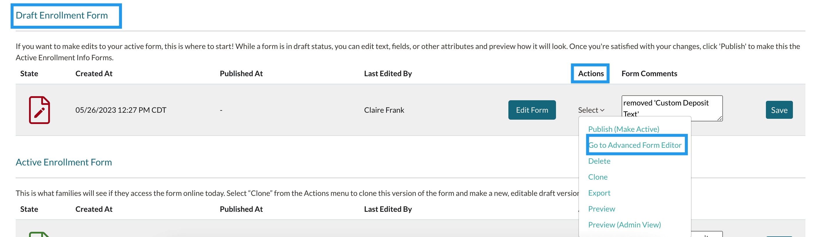 - Within the Draft section, in the Actions column, select Go to Advanced Form Editor.