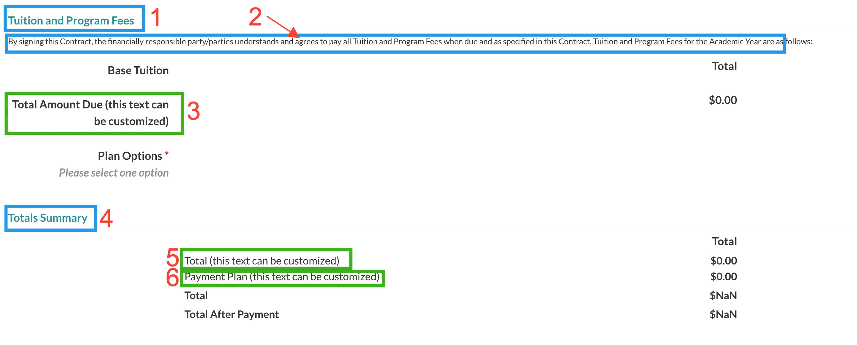 - Text under Tuition and Program Fees (you might not have this on your contract but it can be added if you'd like). Editable in the Basic editor.