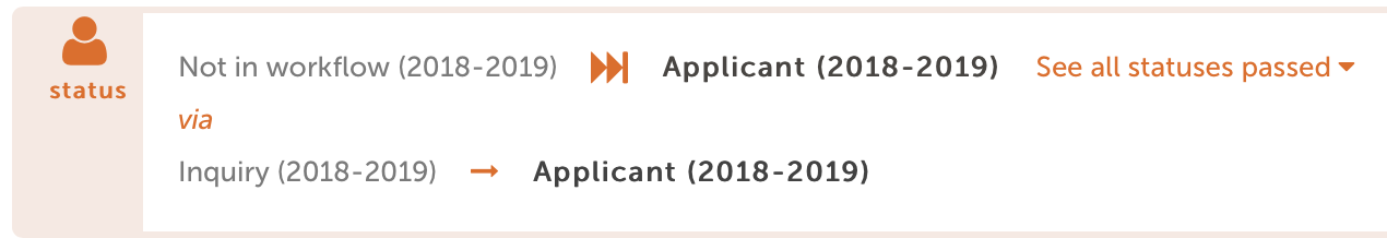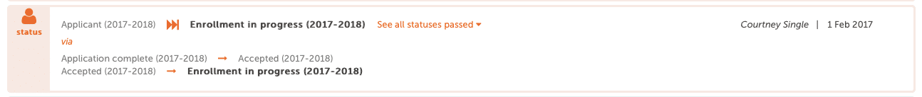If you see an option for See all statuses passed to the right of the status change, this means that a student was moved directly from one status to a later stage status, but they passed multiple other statuses in between the two. -