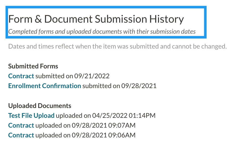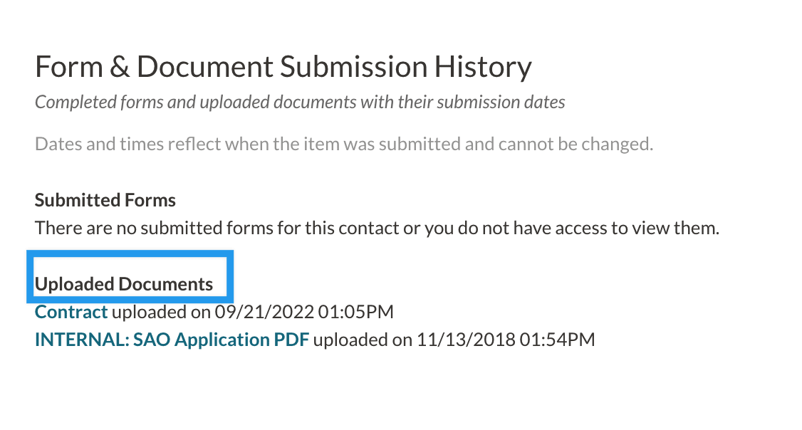 - Your contract will now be listed in the 'Uploaded Documents' section of 'Form & Document Submission History.'