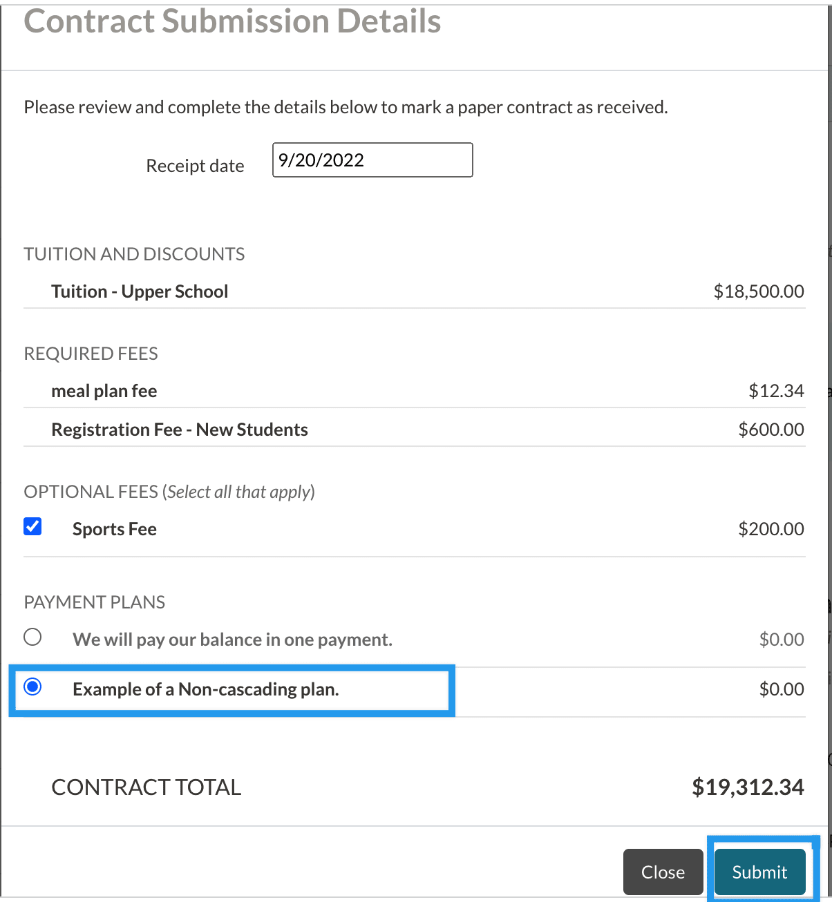 - Select the non-cascading plan in the Payment Plans section.