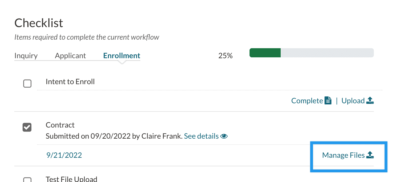 - This will open your computer's file manager. Here, select the downloaded contract and it will upload into the checklist item. The checklist item will appear the same, except that the 'Upload' link will change to a link that says 'Manage Files.'