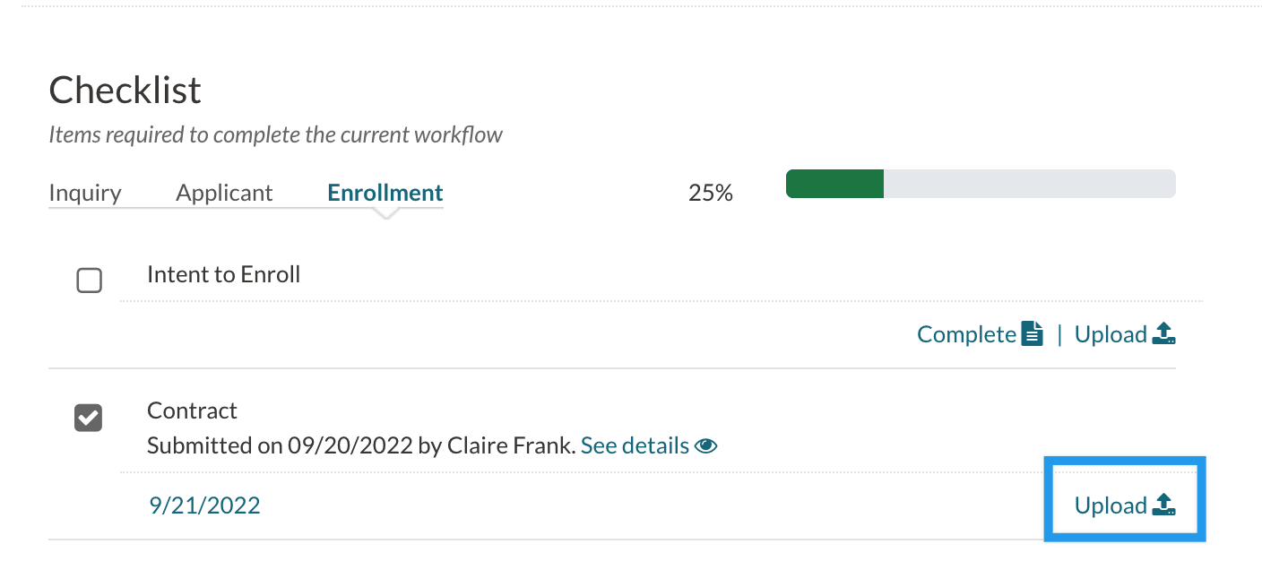 4. On the student's checklist, select 'Upload' on the contract checklist item.